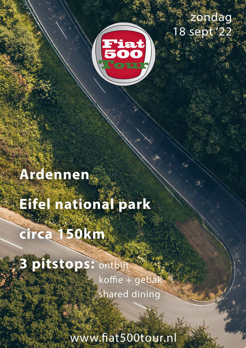 Dit jaar hebben wij een prachtige rit door de Ardennen en de Eifel voor u samengesteld. De 4e Fiat 500 Tour zal circa 150 km afleggen met als startpunt buitenplaats Vaeshartelt met een prachtige ambiance en een kasteel als achtergrond in een geweldige omgeving in Meerssen (nabij Maastricht). Na het ontbijt zal de tour van start gaan richting de prachtige bochtige wegen van de Ardennen en de Eifel.